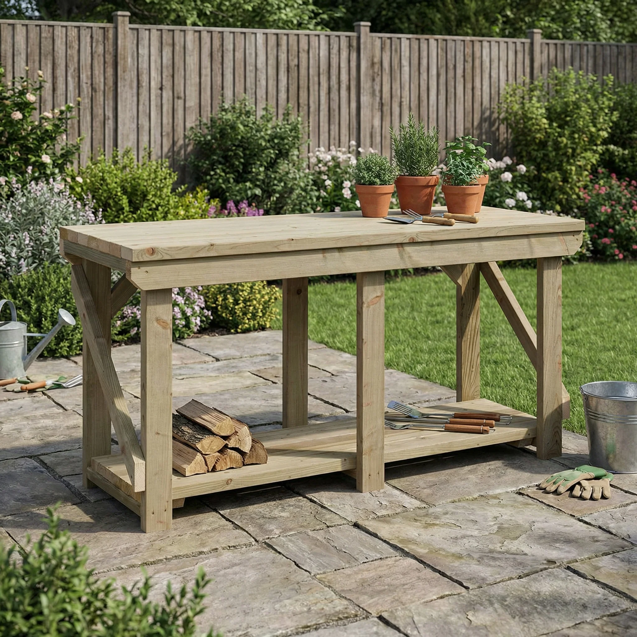 The Heavy-Duty Indoor/Outdoor Workbench is designed to handle even the most demanding outdoor tasks with ease. Constructed from premium CLS C16 pressure-treated timber, it is built to last, offering exceptional durability and resistance to the elements. Models ranging from 6ft to 10ft feature an additional leg, ensuring enhanced stability and sturdiness for intensive use. The workbench is further reinforced with four braces made from 38x89mm construction-grade timber, which effectively prevents side-to-side wobble, providing a secure and reliable workspace.