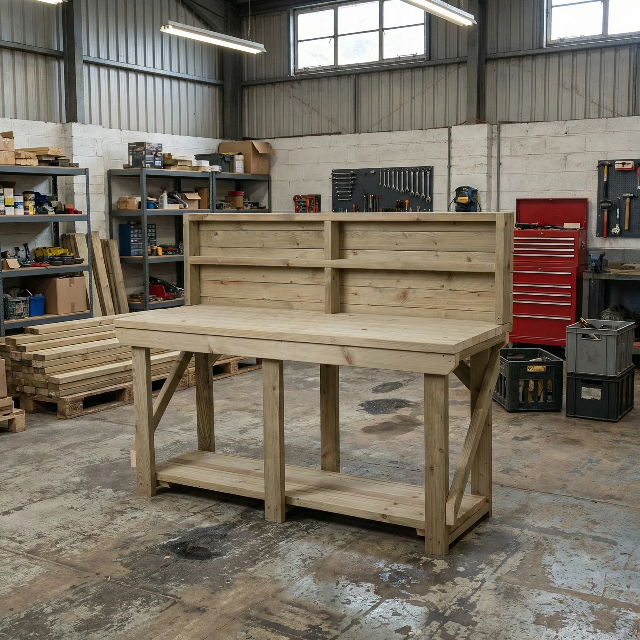 The Heavy-Duty Indoor/Outdoor Workbench is designed to handle even the most demanding outdoor tasks with ease. Constructed from premium CLS C16 pressure-treated timber, it is built to last, offering exceptional durability and resistance to the elements. Models ranging from 6ft to 10ft feature an additional leg, ensuring enhanced stability and sturdiness for intensive use. The workbench is further reinforced with four braces made from 38x89mm construction-grade timber, which effectively prevents side-to-side wobble, providing a secure and reliable workspace.