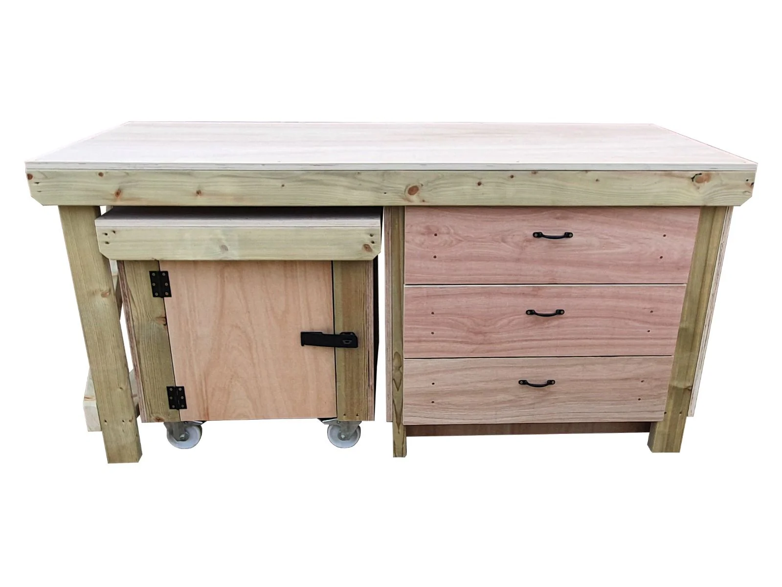 Introducing our Wooden Workbench with Drawers and Functional Lockable Cupboard, expertly crafted to enhance your workspace. Constructed with a robust frame of construction-grade CLS C16 kiln-dried timber, it ensures exceptional durability and stability. The solid 18mm Premium Red Faced Eucalyptus Core Hardwood Plywood work surface provides a smooth platform for various tasks, while the integrated drawers and lockable cupboard offer secure and organized storage for your tools and materials. Handmade in the UK, each bench is supplied in knockdown form for easy on-site assembly, requiring only a screwdriver for setup. Available in lengths from 5ft to 8ft, this workbench combines functionality with superior craftsmanship, making it an ideal choice for both professionals and DIY enthusiasts.
