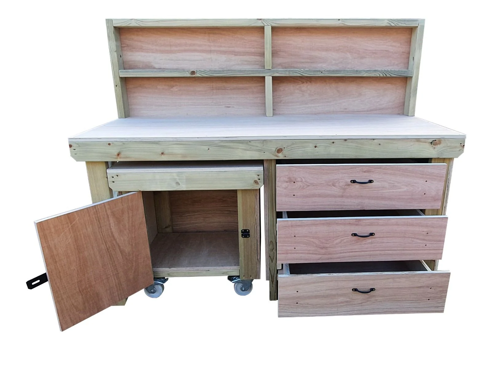 Wooden Eucalyptus hardwood top workbench with drawers and functional lockable cupboard (V.6) with back