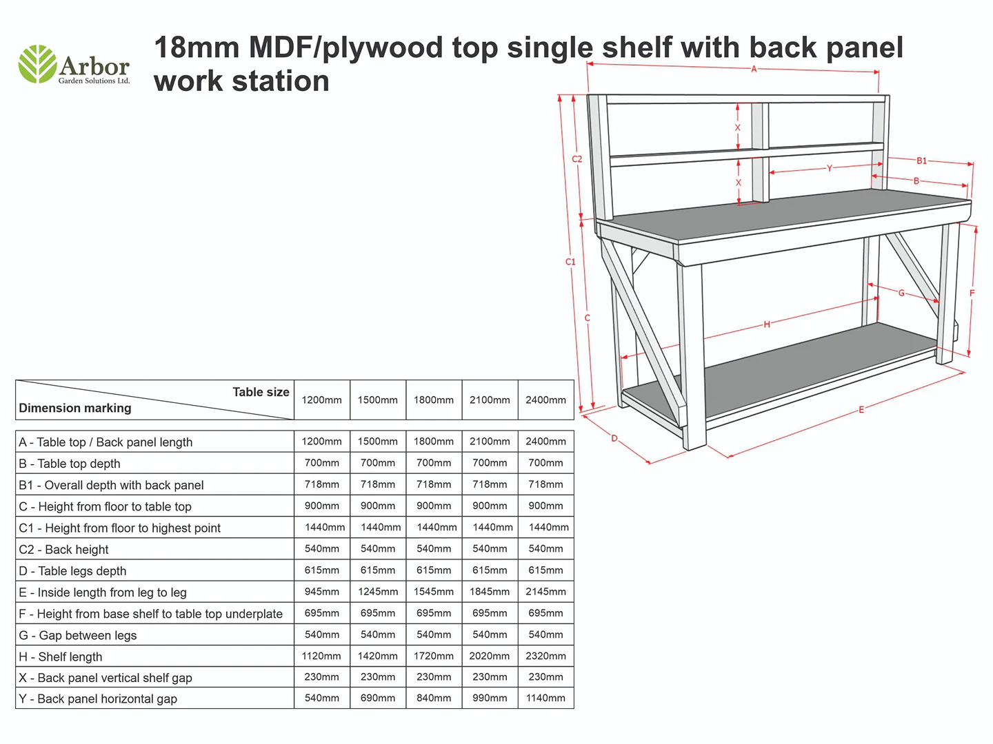 The Wooden MDF Top Workbench from Arbor Garden Solutions is a robust and versatile addition to any workshop or garage. Handcrafted in the UK, this workbench features a frame constructed from construction-grade CLS C16 kiln-dried timber, ensuring durability and stability for various projects. The tabletop and optional shelf are made from 18mm MDF ply sheets, providing a smooth and reliable surface for your tasks.