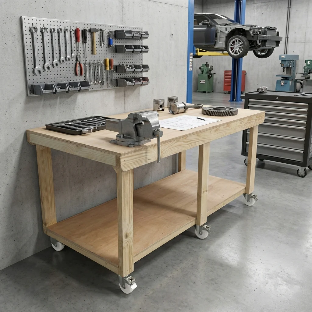 Introducing our Wooden Workbench with Eucalyptus Ply Top, available in 3ft and 4ft widths and equipped with heavy-duty wheels for effortless mobility. Handcrafted in the UK, this workbench features a robust construction-grade CLS C16 kiln-dried timber frame and a premium 18mm Redwood Hardwood Faced Eucalyptus Plywood top, ensuring exceptional strength and durability. Designed for professionals and DIY enthusiasts, its compact size is perfect for workshops, garages, and studios where space is at a premium. The integrated swivel heavy-duty wheels with brake castors allow for easy movement and secure positioning, enhancing your workspace efficiency. Each bench is supplied in a knockdown form for straightforward on-site assembly, requiring only a screwdriver. Upgrade your workspace with this versatile, mobile, and sturdy workbench, built to support all your creative and professional projects.