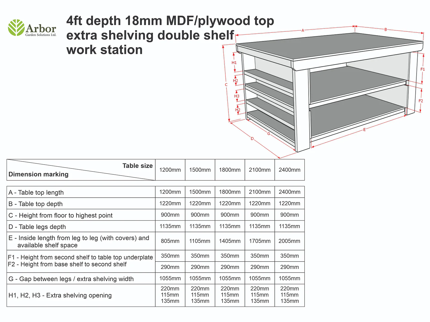 Wooden Workbench MDF Top with Extra shelving Depth-4ft With Double Shelf